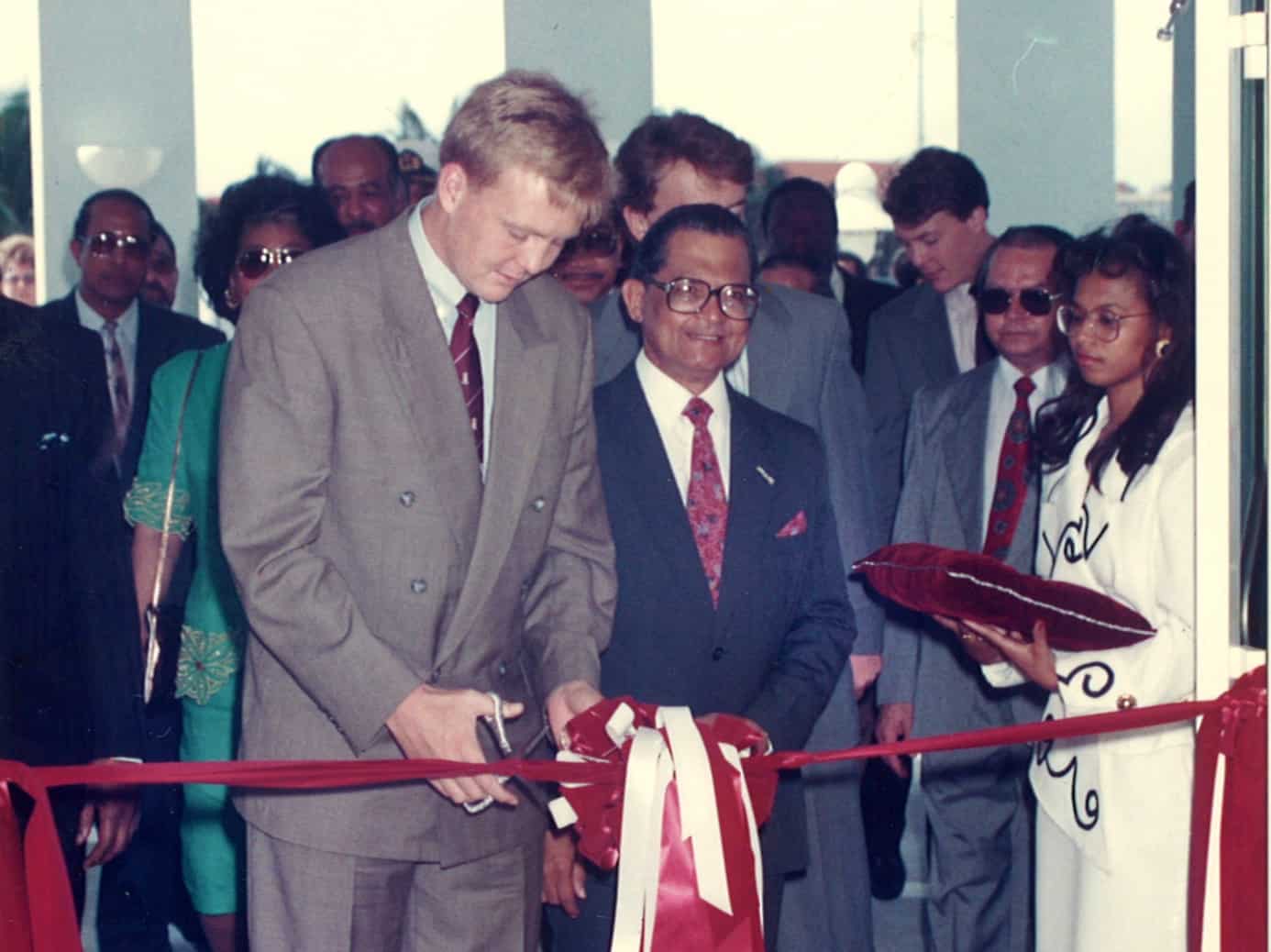 In 1992, Curoil officially opened its new headquarters with a ribbon cutting ceremony by Crown Prince Willem Alexander, then Prince of Orange. The building is located in the historic Scharloo, at the center of Curaçao’s epic architectural landmarks. The new office was designed to be contemporary yet to blend in well with the monuments and historic features in the area, for which Willemstad was awarded the world heritage status in 1997. The office is just outside the inner city of Willemstad and has become a valuable addition to the up and coming monumental commercial district of Curaçao. Today, the Curoil office building hosts numerous events, among which the traditional Christmas tree lighting show on every first Sunday in December.